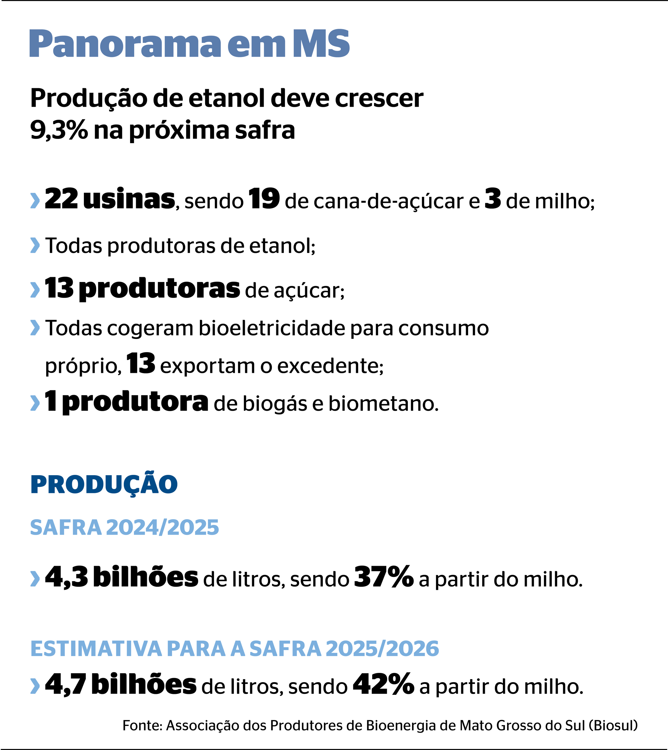 Com esse desempenho, MS já ocupa o posto de segundo maior produtor de etanol de milho do País, atrás apenas de Mato Grosso. No ranking nacional, o Estado também é o quarto maior produtor de etanol de cana-de-açúcar, o quinto de açúcar e o quarto maior exportador de bioeletricidade. Ao todo, são 22 usinas ativas, sendo 19 de cana e três dedicadas exclusivamente ao etanol de milho.