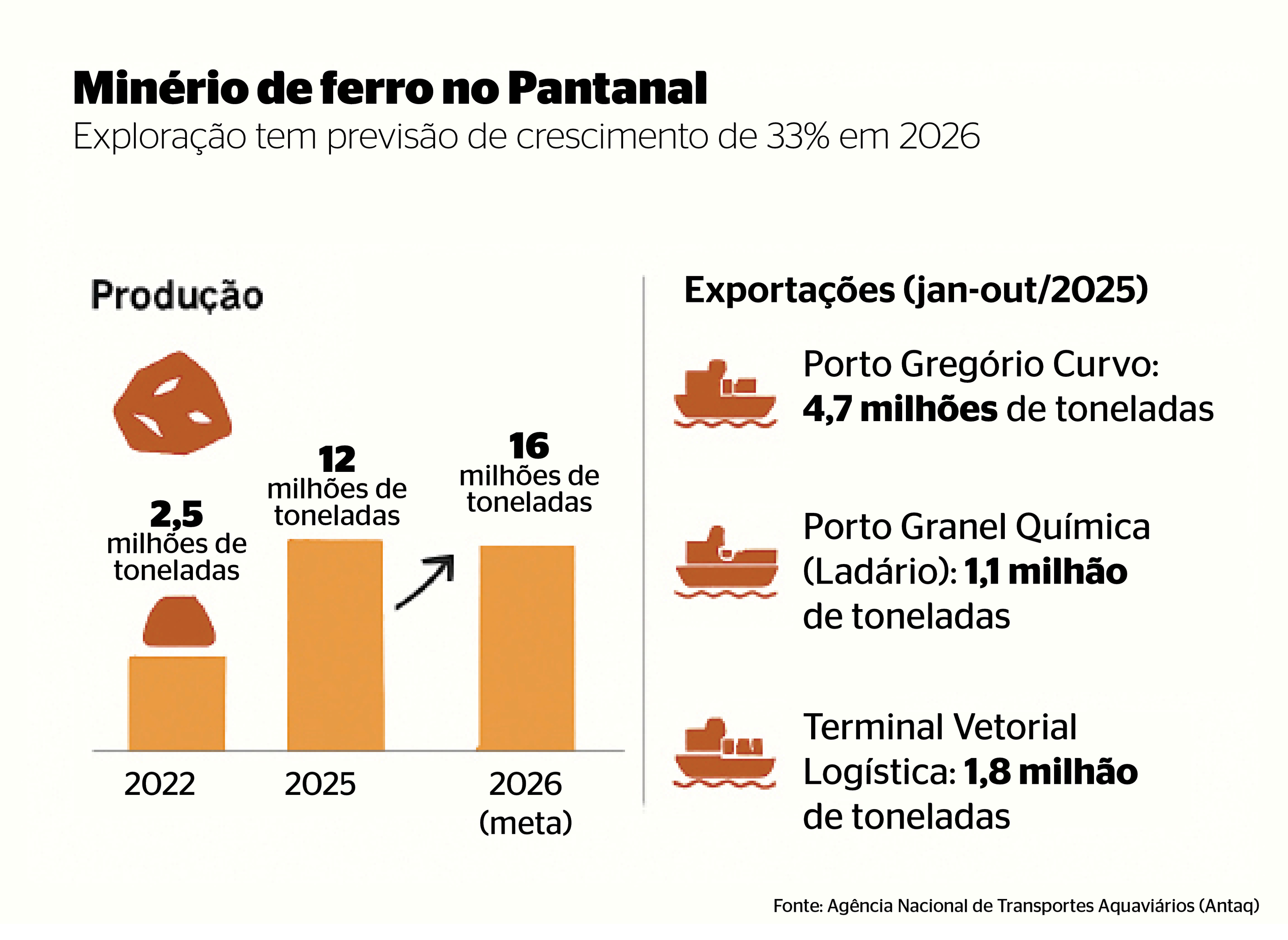 Em 2025, a mineradora dos irmãos Batista chegou a cerca a 12 milhões de toneladas, e para 2026 a meta é de 16 milhões de toneladas - Foto: Bruno Rezende/Governo de MSNo porto Granel Química (Ladário), houve o despacho de 1,1 milhão de toneladas de minério, enquanto no Terminal Vetorial Logística o carregamento foi de 1,8 milhão de toneladas.