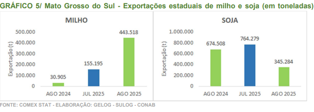 As exportações de soja sul-mato-grossense caíram, consideravelmente. Em compensação, registrou-se aumento dos embarques de milho para exportação. Tal situação é explicada pelo aquecimento das demandas no mercado interno e pelo grande volume de mercadoria produzida pela safra de inverno em MS, que intensificou a necessidade de veículos para escoamento interno.