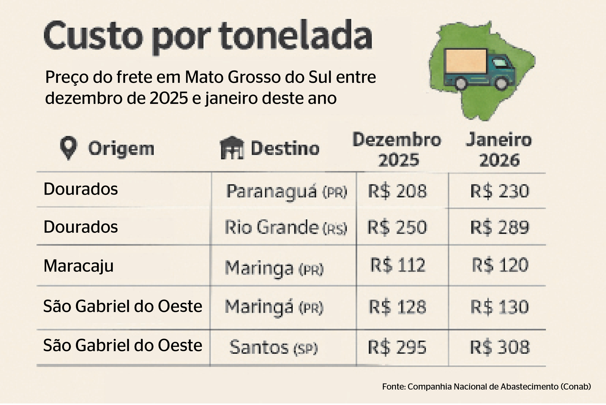 Dados da Conab apontam aumento em todos os principais destinos de escoamento do Estado. Transportar grãos de Dourados para Paranaguá (PR), saltou de R$ 208 por tonelada em dezembro de 2025, para R$ 230 em janeiro deste ano, representando um aumento de 10,6%.