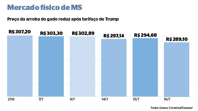 Conforme dados da Granos Corretora, a arroba do boi gordo recuou 5% ou R$ 14,20 em uma semana, saindo de R$ 303,30 no dia 7 – antes do anúncio de Donald Trump–, e chegando a R$ 289,10 ontem.