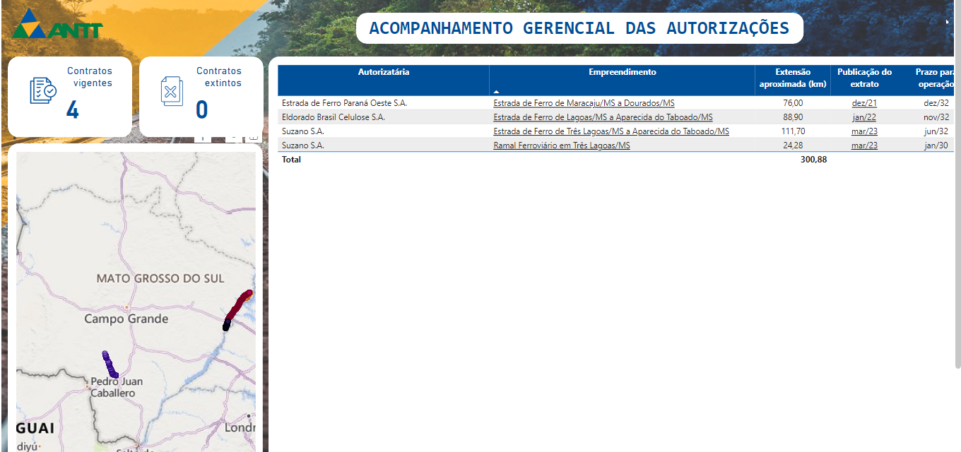 Desde 2021, foram 76 projetos submetidos a autorização pela Agência Nacional dos Transportes Terrestres (ANTT). Destes, 46 contratos foram assinados sendo que quatro são de Mato Grosso do Sul para a construção de ferroviárias em Três Lagoas, Aparecida do Taboado, Maracaju e Dourados.