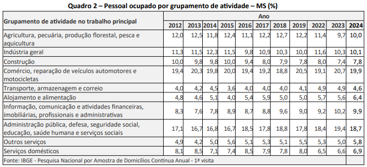 Dos dez grupamentos de atividade no trabalho principal relacionados na PNAD - Contínua, metade teve queda no percentual de pessoas ocupadas entre 2023 e 2024 em Mato Grosso do Sul. Além da agropecuária, é o caso da indústria geral (10,3% para 10,1%),, comércio, reparação de veículos automotores e motocicletas (de 20,7% a 19,9%), transporte, armazenagem e correio (4,9% para 4,6%), informação, comunicação e atividades financeiras (10,2% para 9,9%) e administração pública (19,4% para 18,7%).