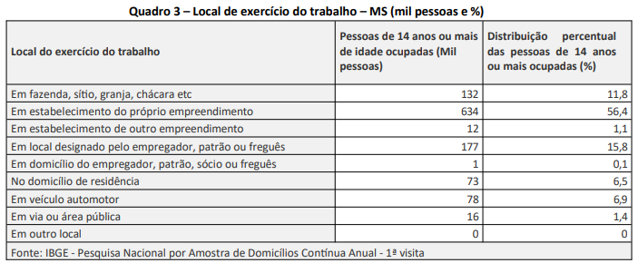O número de pessoas trabalhando em estabelecimento do próprio empreendimento corresponde ao maior percentual dos ocupados, chegando a 56,4% (634 mil). Em seguida, aparece o local designado pelo empregador, patrão ou freguês, com 15,8% (177 mil).