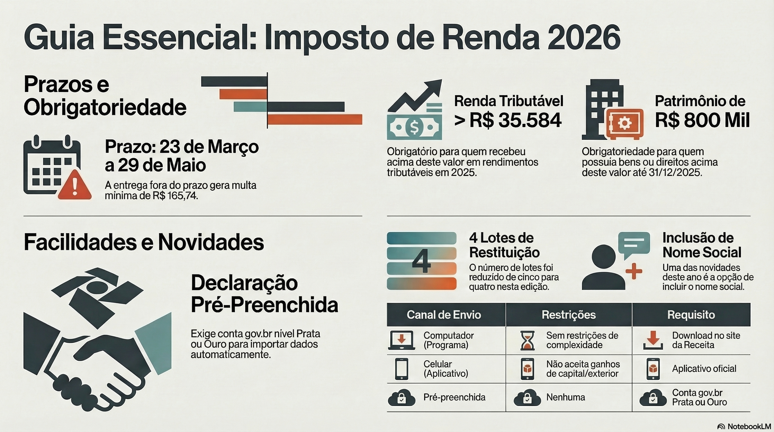 A versão pré-preenchida já está disponível desde o primeiro dia do prazo. Nessa modalidade, o sistema traz automaticamente dados como rendimentos, bens, dívidas e deduções, facilitando o preenchimento.