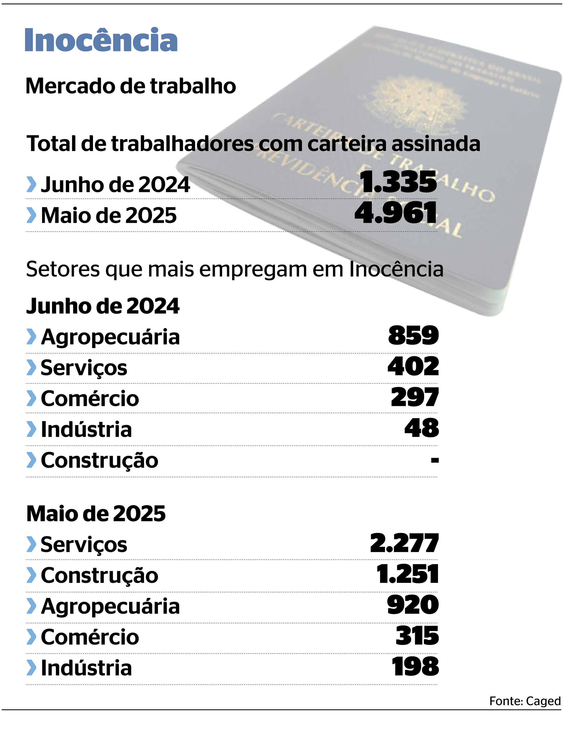 O mercado de trabalho de Inocência também mudou de perfil. Há um ano, a agropecuária era o setor que mais empregava no município, com 859 trabalhadores com carteira assinada. Em segundo lugar apareciam os serviços, com 402, e em terceiro, o comércio, com 297.