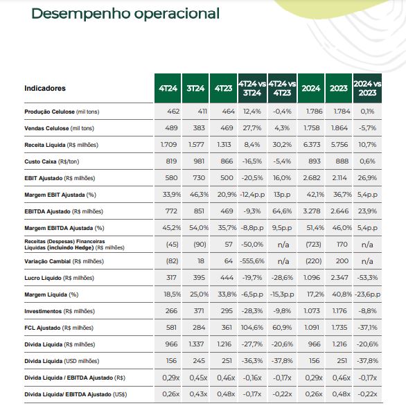 BALANÇO OFICIAL DA ELDORADO RELATIVO A 2024A produção de celulose nos dois anos foi praticamente igual. As vendas tiveram ligeira queda, de 5,7%. A receita líquida aumento 10,7%. As dívidas e os investimentos caíram.