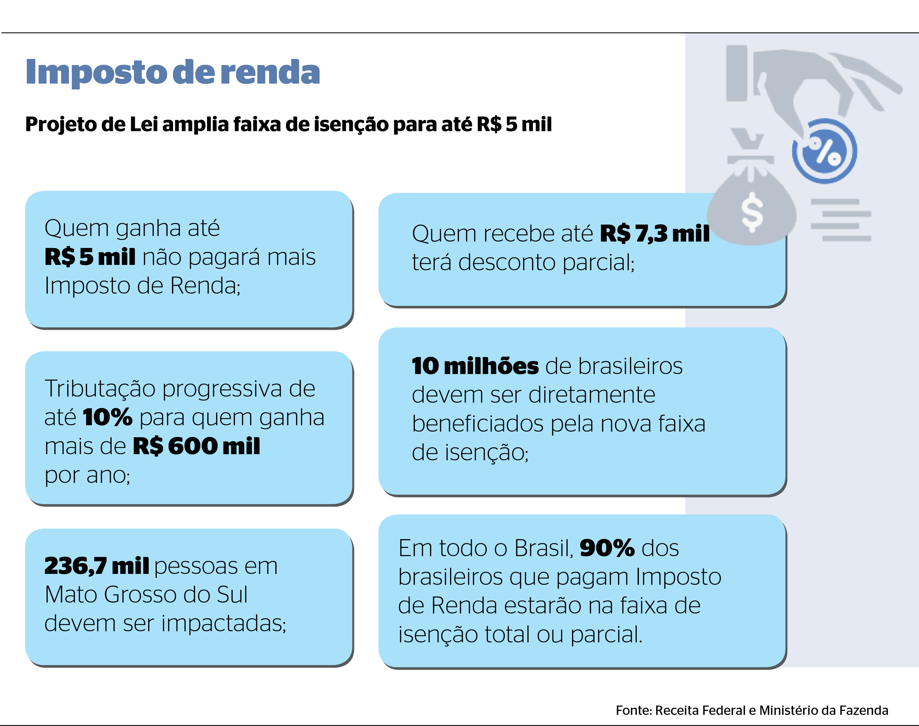De acordo com dados oficiais do governo federal, 162,9 mil sul-mato-grossenses que recebem até R$ 5 mil mensais deixarão de pagar IR caso o projeto seja aprovado. Outros 73,8 mil contribuintes, com renda entre R$ 5 mil e R$ 7,3 mil, terão descontos progressivos, reduzindo a carga tributária.