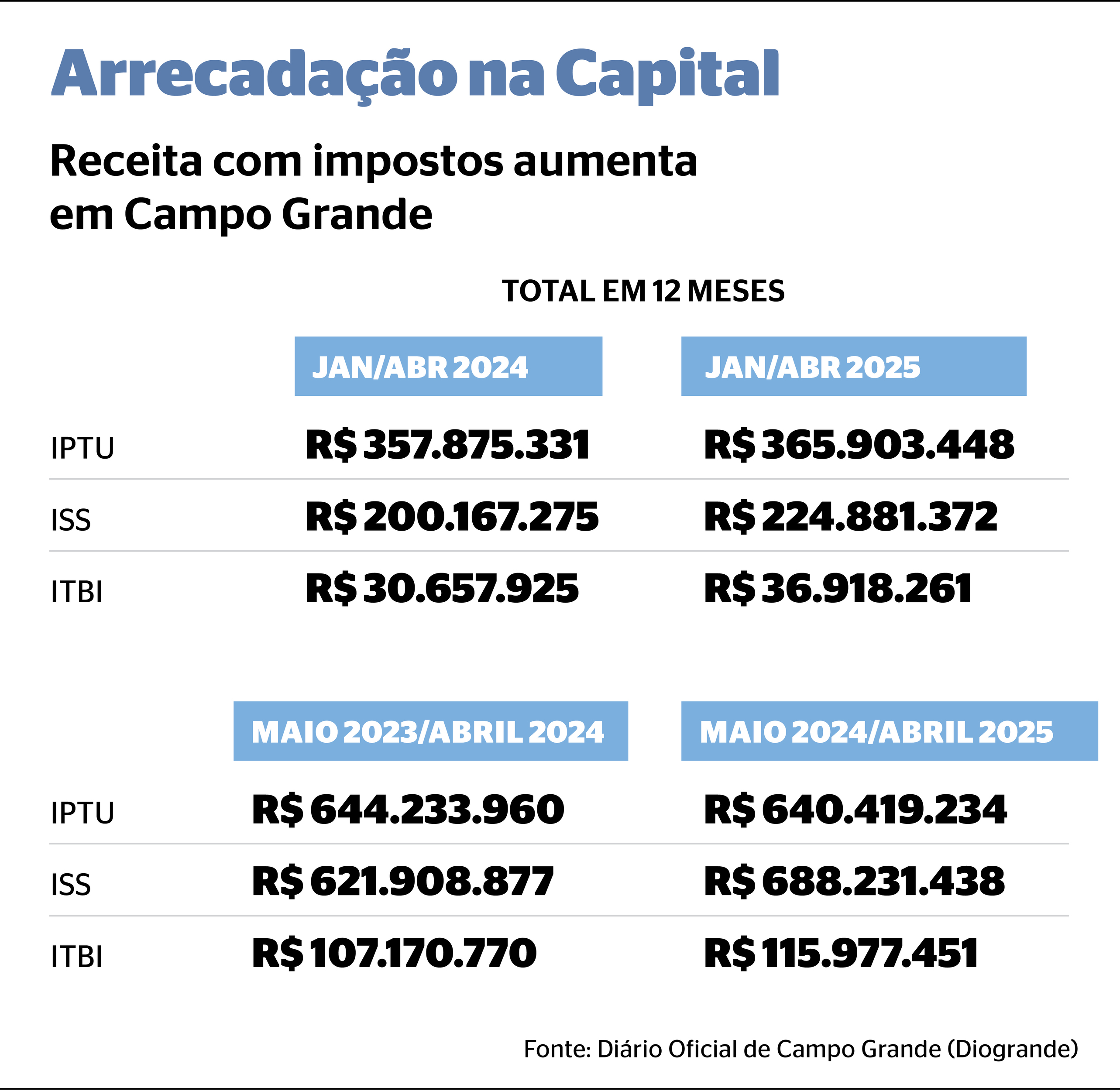 A arrecadação do primeiro quadrimestre deste ano consolidou o Imposto sobre Serviços (ISS) como responsável pelo crescimento das finanças municipais em Campo Grande. De acordo com dados publicados no Diário Oficial do Município, o tributo apresentou crescimento de 12,3% em relação ao mesmo período do ano anterior, permitindo à prefeitura manter o equilíbrio fiscal mesmo diante da retração nos repasses do Imposto sobre Circulação de Mercadorias e Serviços (ICMS), principal transferência de recursos do governo estadual.