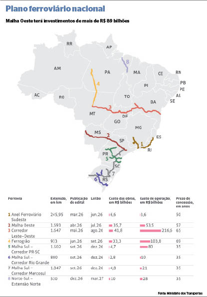 O leilão da ferrovia Malha Oeste, que liga Corumbá a Mairinque (SP), está programado para julho deste ano, com edital previsto para abril, dentro da primeira Política Nacional de Outorgas Ferroviárias lançada pelo governo federal. O vencedor do leilão vai ter de investir R$ 89,2 bilhões ao longo de 57 anos para garantir o funcionamento de 1.593 km de linha férrea, segundo o Ministério dos Transportes.