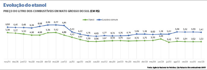 O preço do litro do etanol registra queda de 34,38% no período de dois anos em Mato Grosso do Sul. Segundo dados da Agência Nacional do Petróleo, Gás Natural e Biocombustíveis (ANP), em novembro de 2021, o litro do biocombustível era comercializado, em média, a R$ 5,38, enquanto neste ano é comercializado a R$ 3,53.