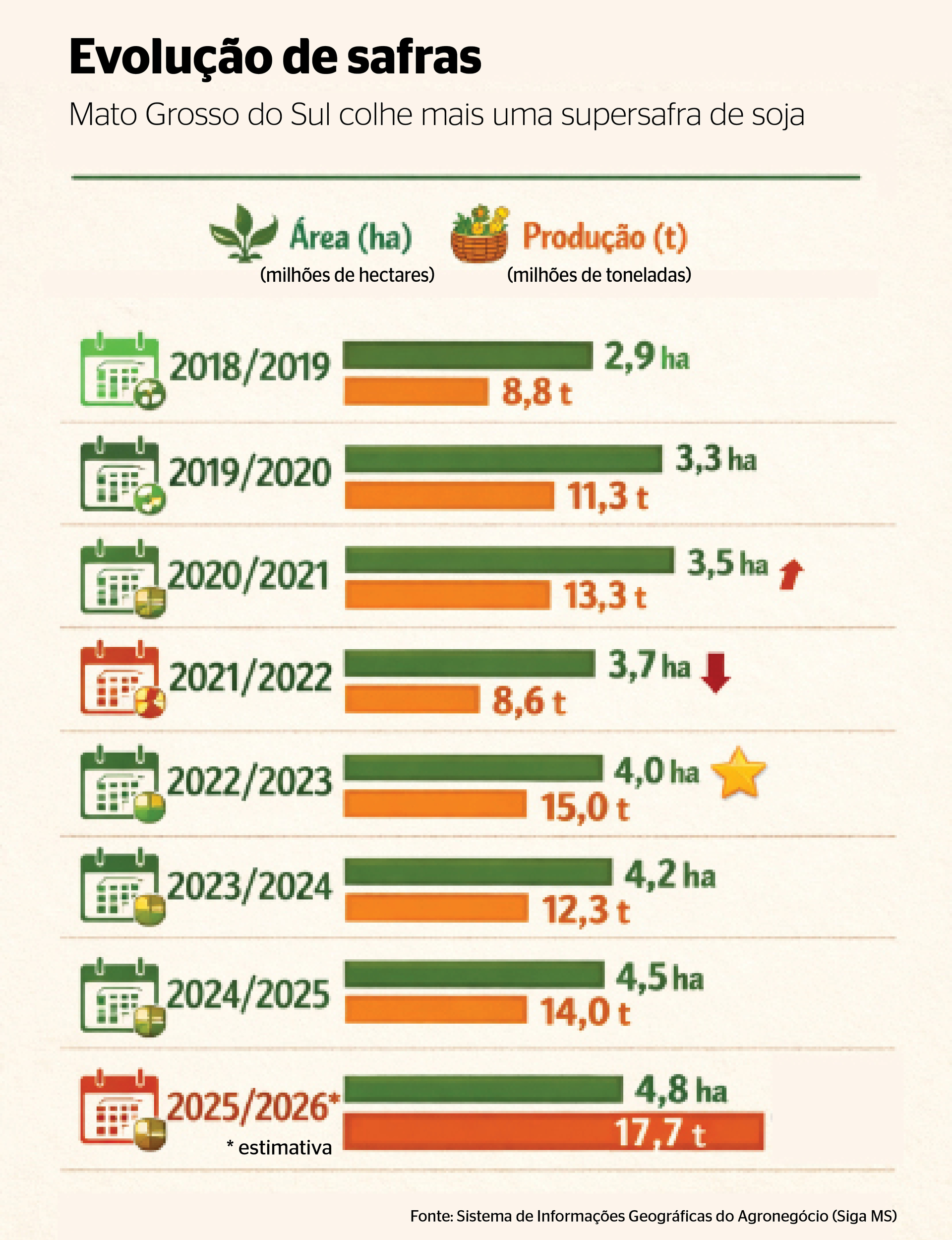O boletim Casa Rural, elaborado pela Federação da Agricultura e Pecuária de Mato Grosso do Sul (Sistema Famasul) e a Associação dos Produtores de Soja de MS (Aprosoja-MS), aponta, após a amostragem de produtividade em 19,5% da área, uma produtividade média de 61,73 sacas por hectare, representando um aumento de 19,2% em relação ao ciclo anterior.