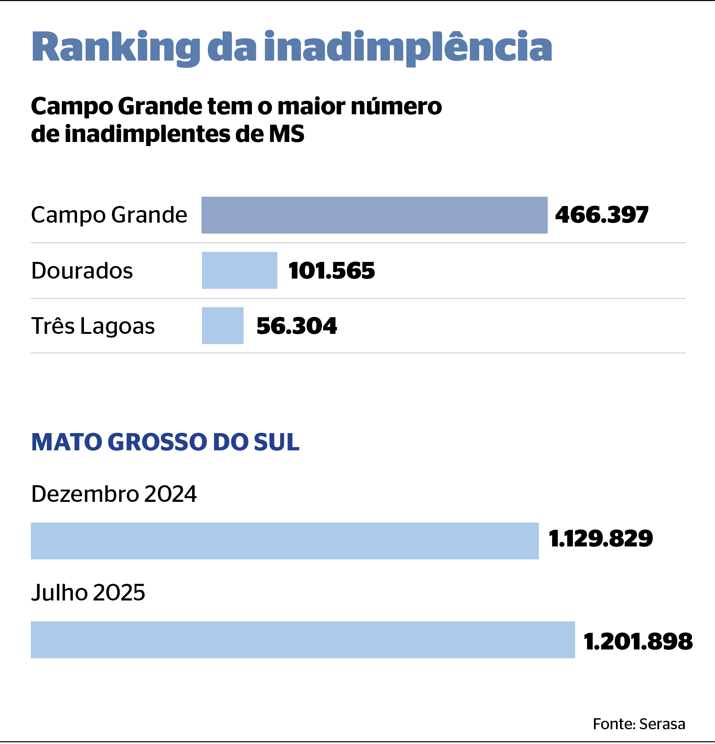 Em seguida, Dourados aparece com 101.565 nomes negativados, somando R$ 736,9 milhões. Três Lagoas e Bonito também registram números expressivos, com dívida média por consumidor de R$ 6,8 mil e R$ 6,3 mil, respectivamente.