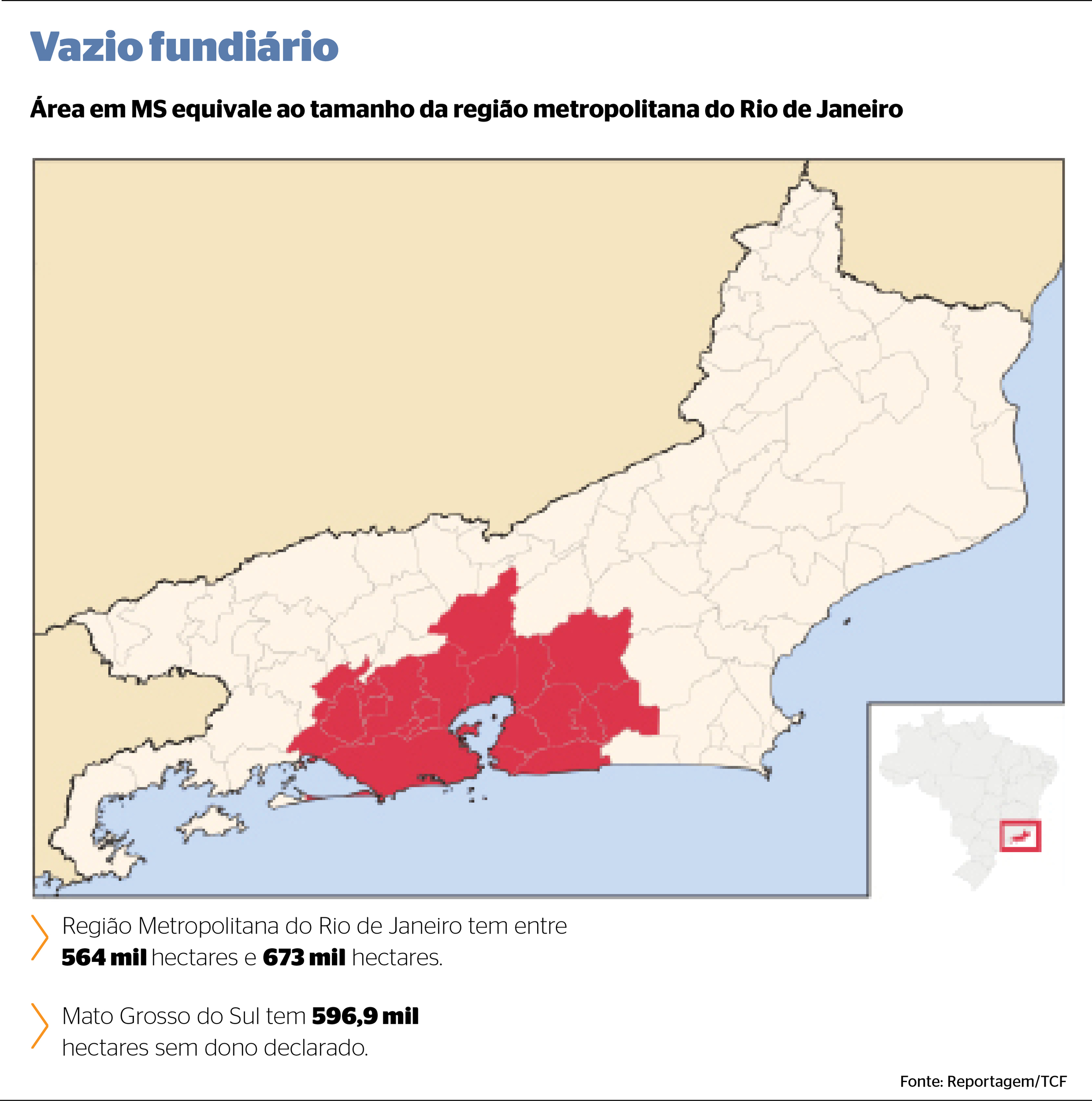 Mato Grosso do Sul tem 597 mil hectares sem dono declarado, os chamados vazios fundiários, e outros 341,1 mil hectares sem o Cadastro Ambiental Rural (CAR), de acordo com o Termômetro do Código Florestal (TCF), divulgado no fim do mês passado. A área no Estado equivale quase ao tamanho da região metropolitana do Rio de Janeiro (RJ).