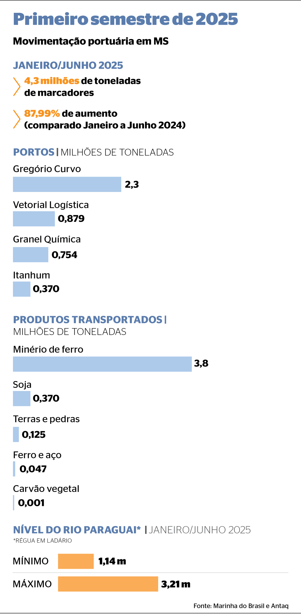 A movimentação portuária em Mato Grosso do Sul foi de 4,3 milhões de toneladas entre janeiro e junho deste ano. O Porto Gregório Curvo, que tem gestão da LHG Mining e fica na região de Porto Esperança, registrou 2,3 milhões de toneladas.