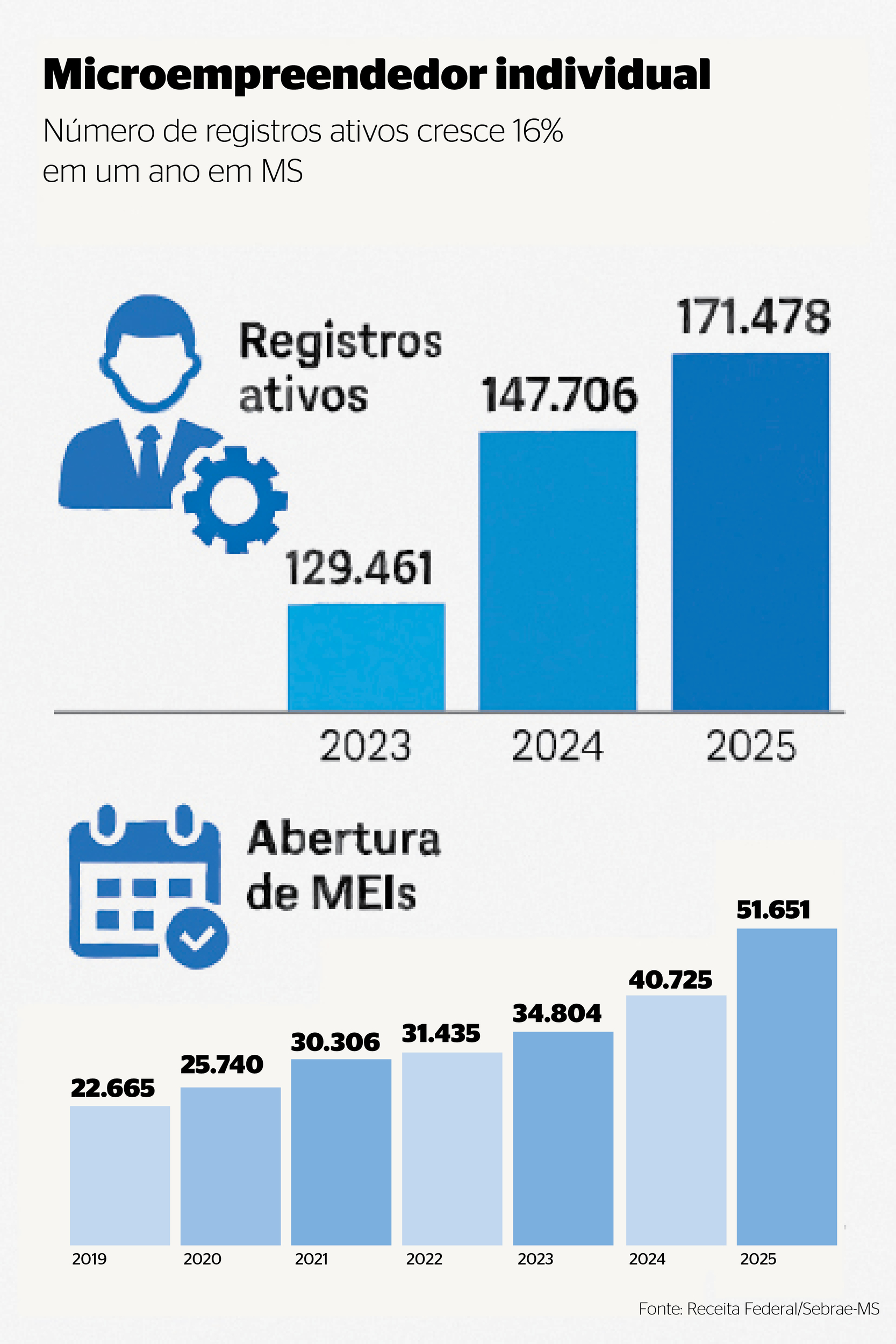 Já o número de microempreendedores individuais ativos – considerando novos, antigos e fechamentos – cresceu 16% no intervalo de um ano. Conforme dados da Receita Federal, divulgados pelo Sebrae-MS, em 2024, o Estado tinha 147.706 registros ativos, enquanto, no ano passado, o número chegou a 171.478.