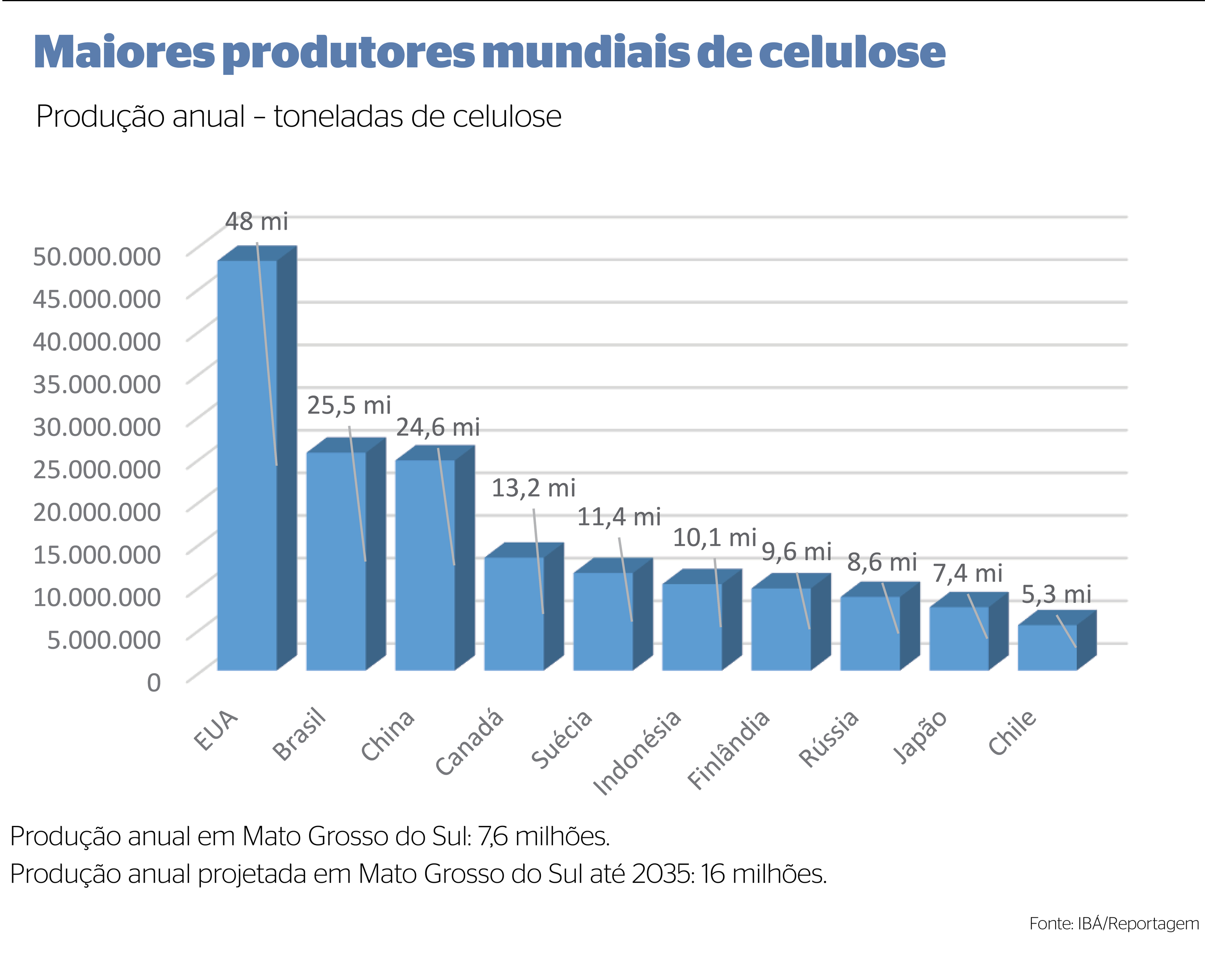 Hoje, o Brasil é o segundo maior produtor de celulose do planeta. No ano passado, superou a China, e só está atrás dos Estados Unidos, que produz em torno de 48 milhões de toneladas de celulose. Sozinho, Mato Grosso do Sul produz mais celulose que o Japão, o nono maior produtor mundial, com 7,4 milhões de toneladas por ano.