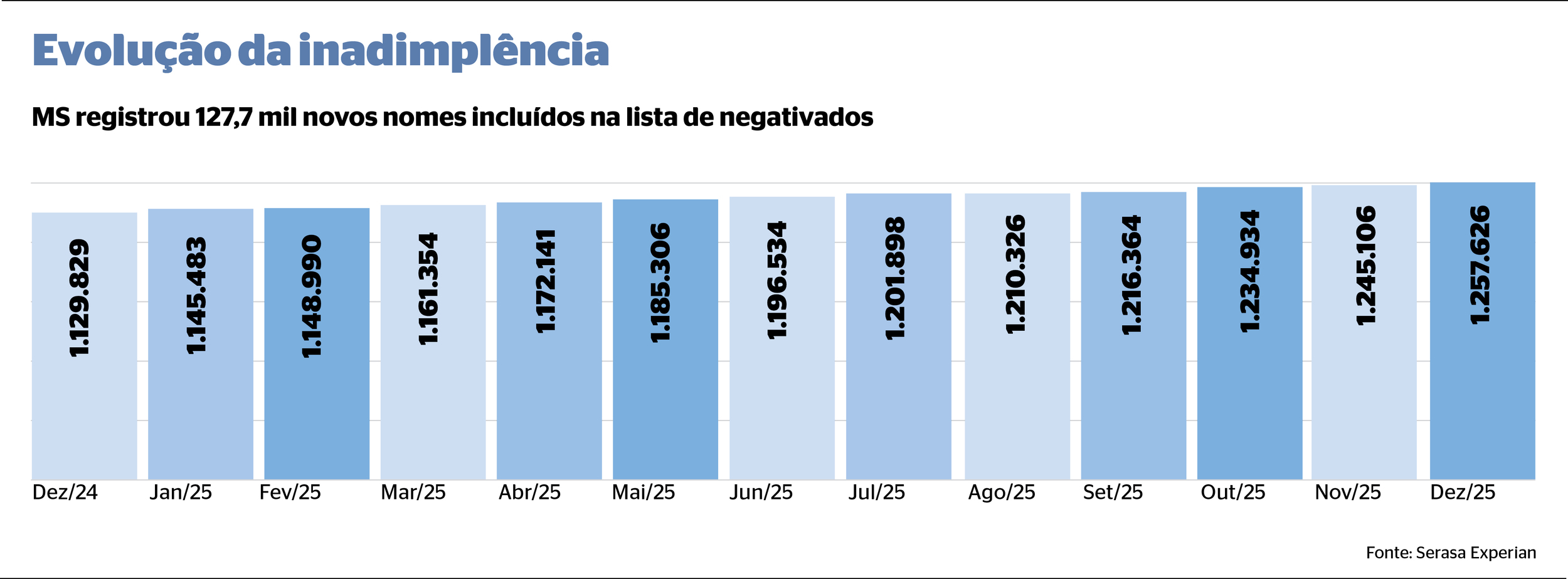 Em todo o ano passado, o número de consumidores sul-mato-grossenses incluídos na lista de inadimplentes atingiu o nível mais alto da série histórica e já compromete mais da metade da população adulta. Conforme os dados da Serasa, o Estado somou 127,7 mil novos cadastros nos 12 meses de 2025, uma média de 505 novas negativações por dia útil.