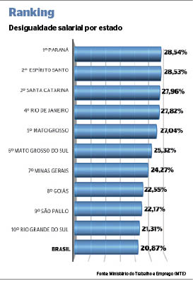 De acordo com o relatório, as menores disparidades de remuneração entre homens e mulheres estão em estados como Pernambuco (9,14%), Acre (9,86%), Distrito Federal (9,97%), Piauí (10,04%), Ceará (10,21%) e Alagoas (11,08%). Já na outra extremidade do ranking, com as maiores desigualdades, figuram Paraná (28,54%), Espírito Santo (28,53%), Santa Catarina (27,96%) e Rio de Janeiro (27,82%).