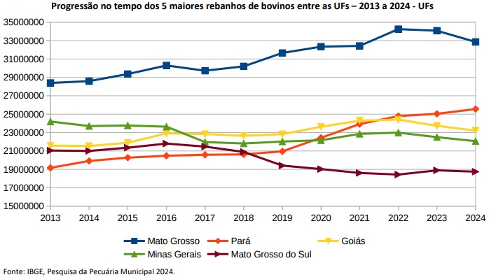 O efetivo de bovinos de 2024, ano-referência da pesquisa, representa uma diminuição de 0,8% em comparação ao ano anterior, quando haviam 18.891.916 de bovinos do Estado.