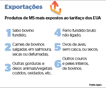 Também no ano passado, Mato Grosso do Sul exportou US$ 669,6 milhões (R$ 3,5 bilhões). Porém, há em mais da metade da lista produtos que podem conquistar mercados alternativos. Os produtos sul-mato-grossenses mais expostos a tarifas já aplicadas ou a eventuais novas tarifas dos Estados Unidos são o ferro fundido, sebo bovino, couro, carne bovina salgada (em salmoura ou defumada), gorduras e óleos animais e ovos (in natura ou em pó).