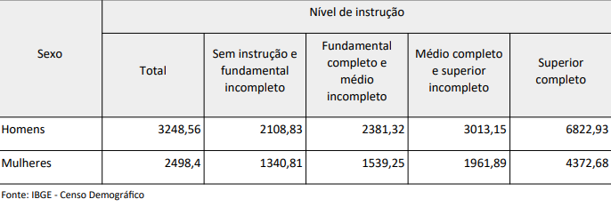 No ano em questão da pesquisa, homens recebiam rendimentos mensais superior às mulheres em todos os níveis de instrução analisados, sendo a maior diferença na categoria do ensino superior completo, com quase R$2,5 mil reais de diferença.