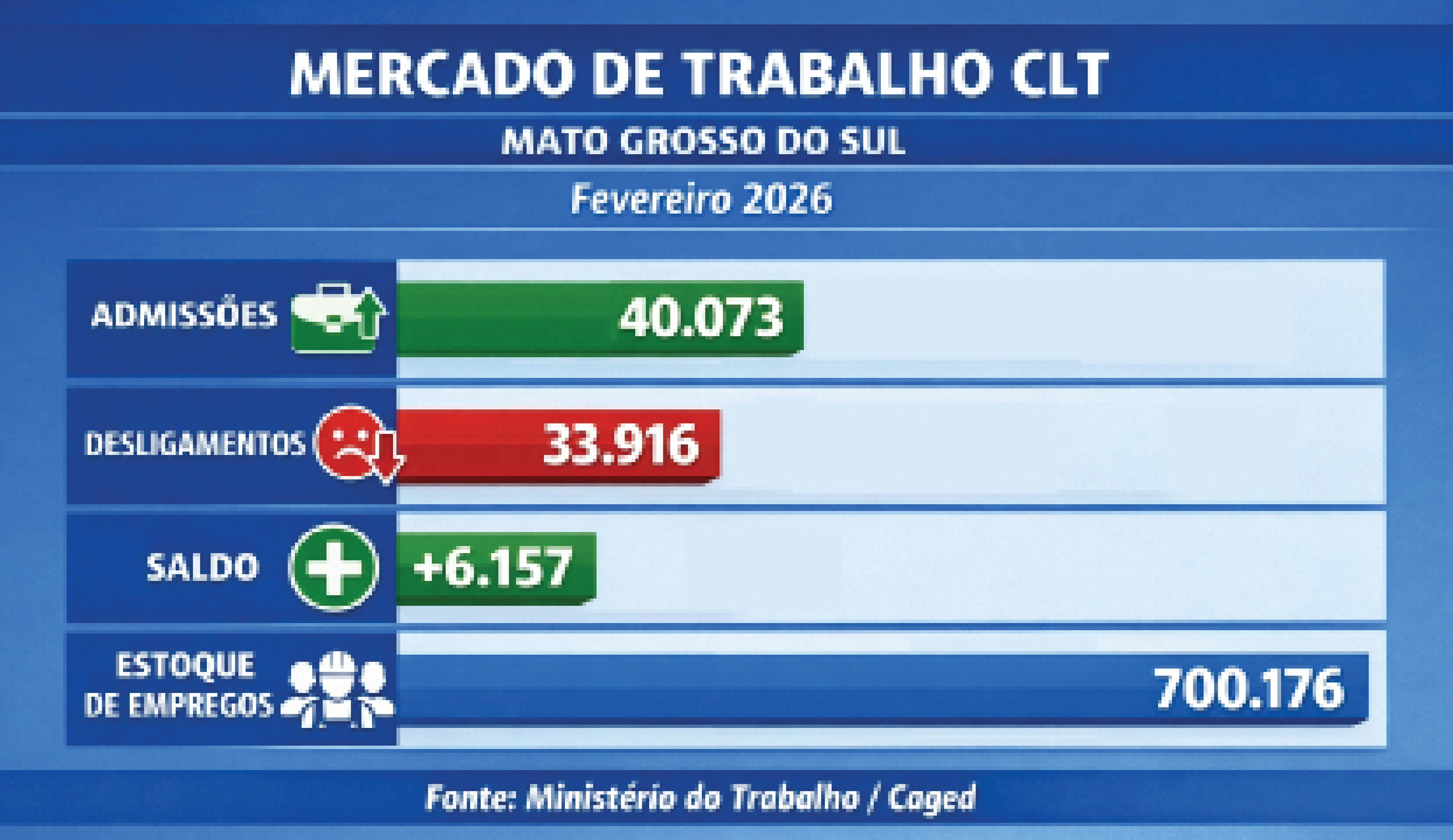 Em fevereiro deste ano, Mato Grosso do Sul também ultrapassou um marco histórico para o mercado de trabalho: rompeu a barreira dos 700 mil trabalhadores com carteira assinada, com contrato pela Consolidação das Leis do Trabalho (CLT), o regime aferido pelo Caged.