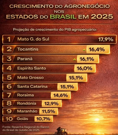 “O ranking do crescimento do setor primário revela um Brasil em movimento. Todos os estados do ranking crescem em dois dígitos, indicando que 2025 tende a ser um ano excepcional para o agro brasileiro, apoiado por produtividade, inovação e competitividade internacional. O agro segue como pilar do desenvolvimento econômico do Brasil”, ressaltou o secretário.
