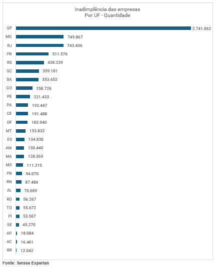 Com relação aos estados, São Paulo continua como líder absoluta, com mais de 2,7 milhões de empresas com um ou mais compromissos vencidos e não pagos. Em seguida, vem Minas Gerais, com 749.867 mil, seguida pelo Rio de Janeiro, com 743.463 mil.