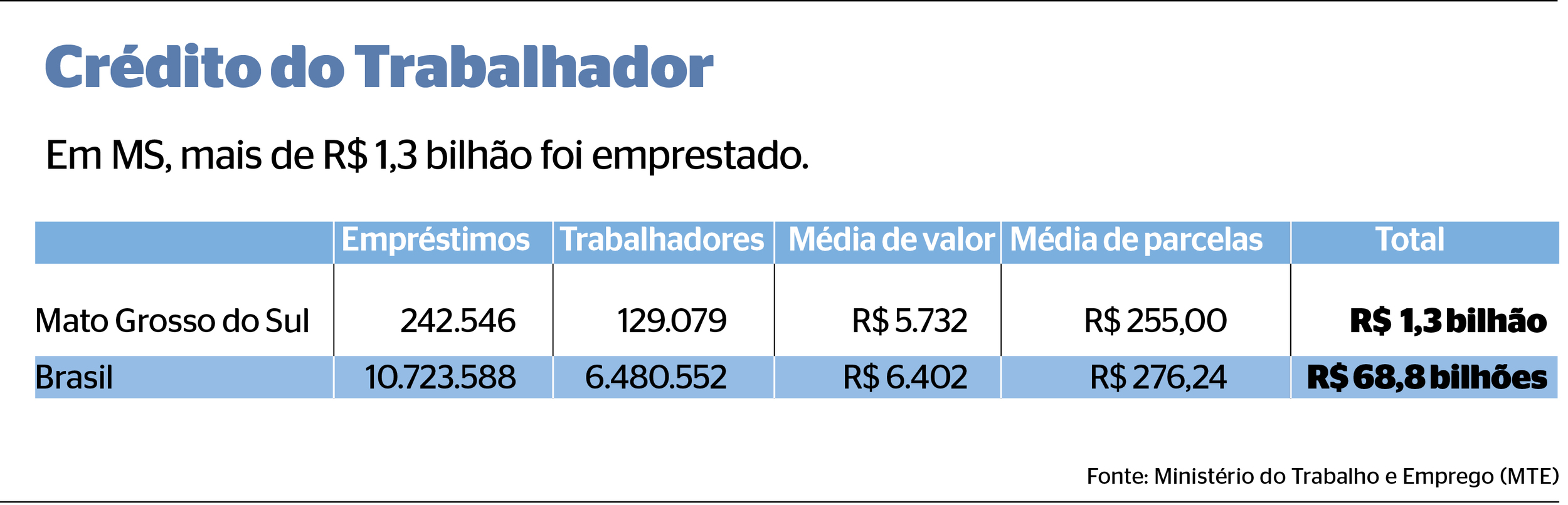 Os trabalhadores com carteira assinada em Mato Grosso do Sul contrataram R$ 1,3 bilhão em empréstimos consignados na modalidade CLT, de acordo com dados inéditos enviados pelo Ministério do Trabalho e Emprego (MTE) ao Correio do Estado. Foram firmados 242.516 contratos no Crédito do Trabalhador, por 129.079 pessoas, com prestação média mensal de R$ 255,00, e valor médio de empréstimo de R$ 5.732,26.