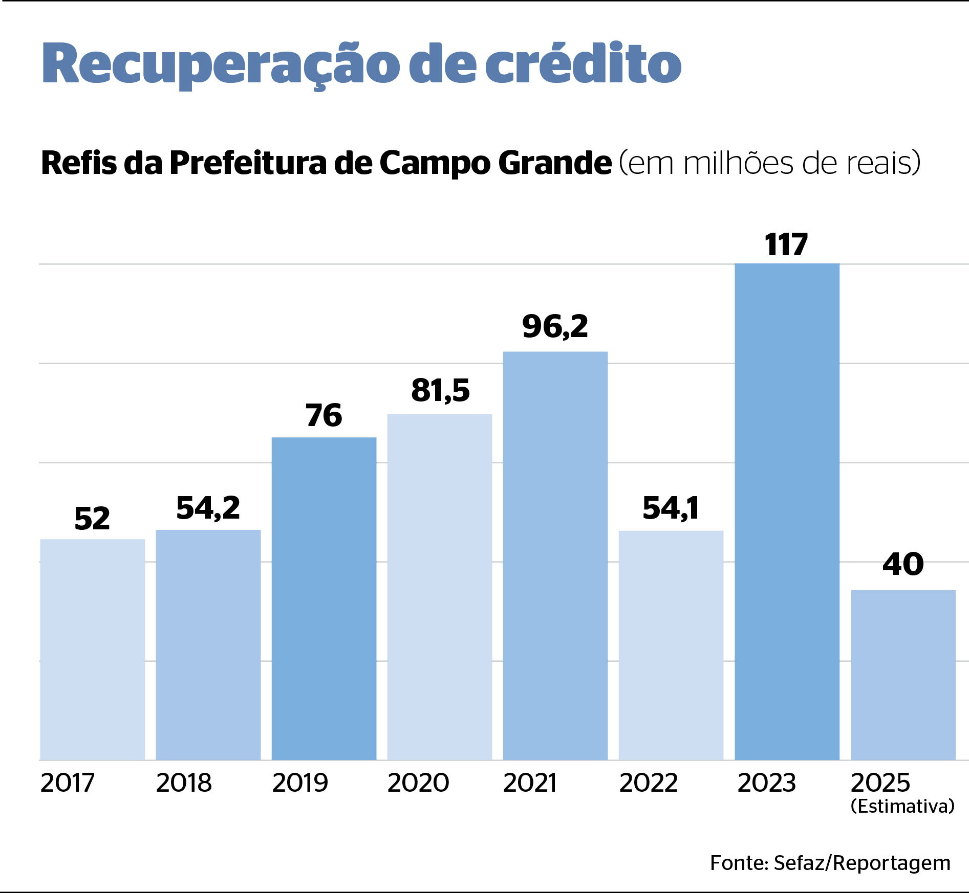 Em 2019, a gestão contou com R$ 76 milhões renegociados. No primeiro ano da pandemia de Covid-19 (2020), foram recuperados R$ 81,5 milhões, em 2021, foi registrado o maior montante já recuperado com o Refis em Campo Grande, R$ 96,2 milhões, e, em 2022, foram R$ 54,1 milhões que entraram nos cofres do município.
