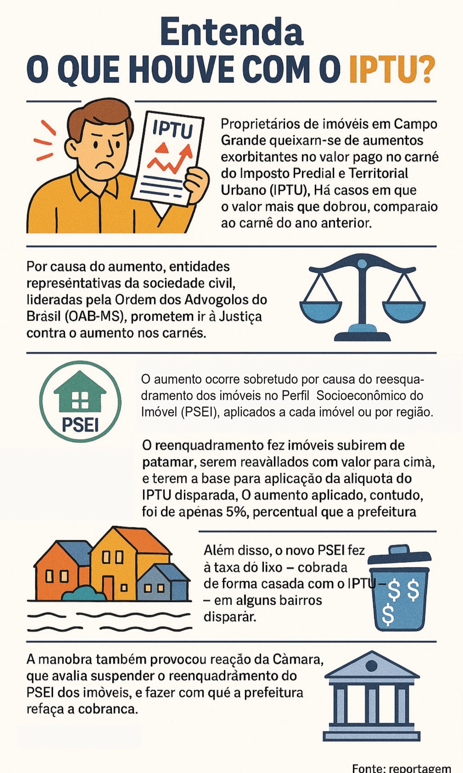 O curioso é que o projeto de lei que permitiu o aumento no valor cobrado nos carnês deste ano foi aprovado pela Câmara Municipal de Campo Grande em outubro do ano passado: a mudança do Perfil Socioeconômico Imobiliário (Psei) dos imóveis de Campo Grande.