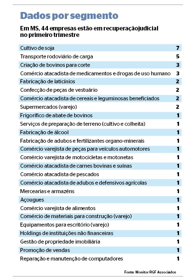 O número de empresas em recuperação judicial disparou em Mato Grosso do Sul. Conforme levantamento do Monitor de Recuperações Judiciais da RGF Associados, no primeiro trimestre deste ano, 44 empresas recorreram à recuperação judicial (RJ). No mesmo período do ano passado, o número de empresas que apelaram ao Judiciário era de 28 – alta de 57% em um ano.