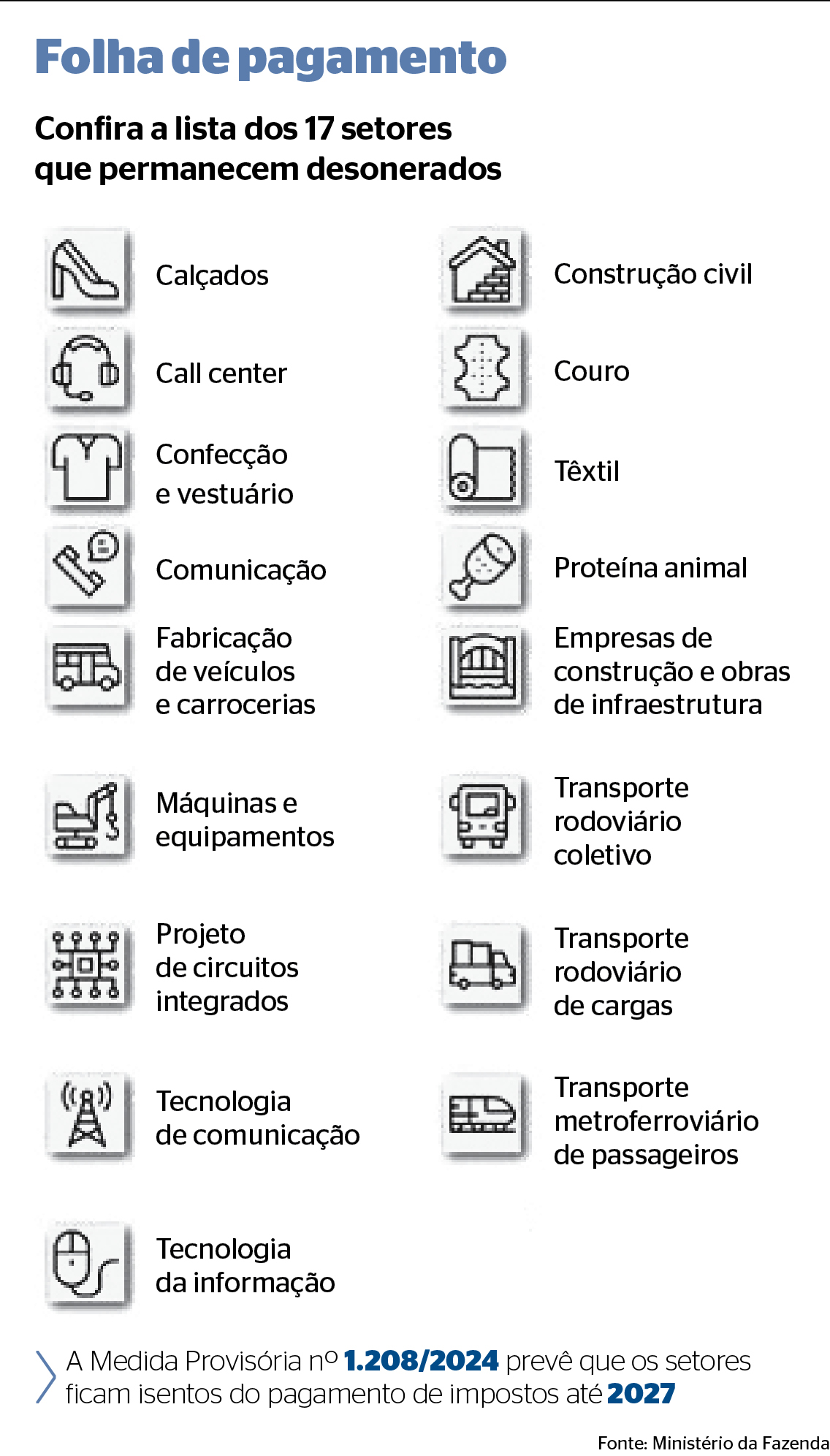 Por outro lado, manteve o dispositivo para os municípios. A lei aprovada no Congresso de forma parcial prorrogou a desoneração dos setores que incluem serviços como comunicação, calçados, call center, confecção e vestuário, construção civil, empresas de construção e obras de infraestrutura, entre outros, até 2027.