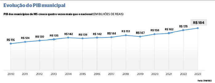 O Produto Interno Bruto (PIB) dos 79 municípios sul-mato-grossenses cresceu R$ 68 bilhões entre 2010 e 2023, pulando de R$ 116 bilhões para R$ 184 bilhões, de acordo com o levantamento da Confederação Nacional dos Municípios (CNM). Só entre 2022 e 2023 o incremento foi de 5,44%, mantendo o constante crescimento, que foi interrompido apenas duas vezes na comparação anual.