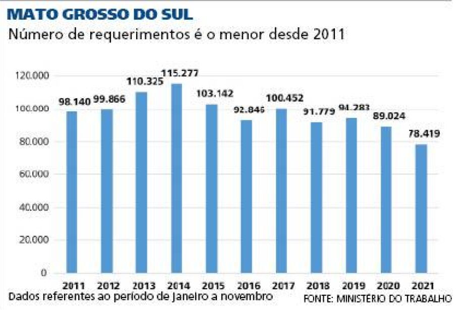 Conforme os dados do Ministério do Trabalho de janeiro à novembro de 2020 foram 89.024 requerimentos no Estado, enquanto no mesmo período deste ano o número chegou a 78.419.