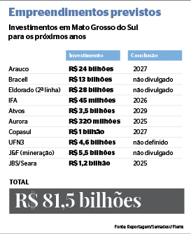 Além da celulose, o grupo J&F, dos irmãos Joesley e Wesley Batista, ainda planeja aplicar R$ 5,5 bilhões na ampliação da produção de minério de ferro e manganês em Corumbá. Ainda na holding dos Batista, a JBS está investindo R$ 1,2 bilhão na unidade da Seara e deverá contratar mais 2 mil trabalhadores para o frigorífico de suínos em Dourados.