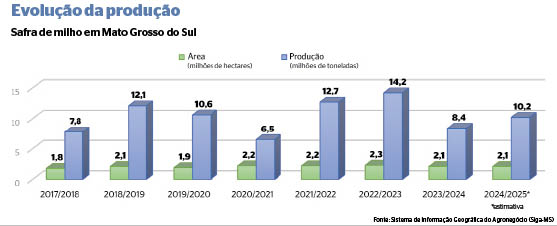 No ciclo 2022/2023, a produção do milho foi de 14,220 milhões de toneladas em MS.