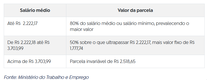 A parcela do seguro-desemprego é calculada com base na média das três últimas remunerações do trabalhador antes da demissão. Após a correção das faixas salariais, o benefício será definido da seguinte forma: