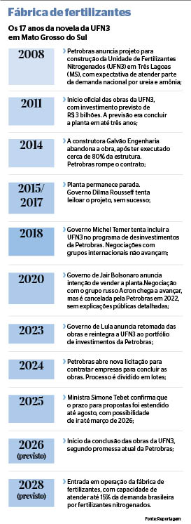 A Petrobras voltou a prometer prioridade para a retomada da Unidade de Fertilizantes Nitrogenados (UFN3), em Três Lagoas, mas, na prática, o cronograma mais uma vez foi “empurrado” para a frente. A estatal anunciou novos passos burocráticos, enquanto a produção de ureia, fundamental para reduzir a dependência de importações, só deve começar a partir de 2028 no cenário mais otimista.