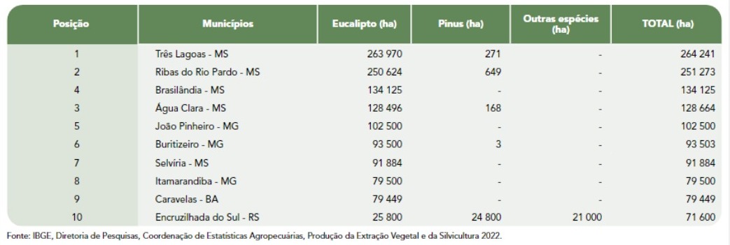 No ranking dos dez maiores municípios, mais um sul-mato-grossense se destaca: Selvíria ocupa a sétima posição em área de floresta plantada, com 91.884 ha de eucalipto. Confira: