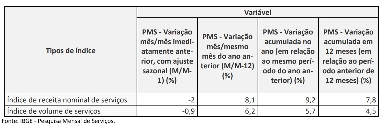 Conforme divulgado pelo Instituto, a PMS em novembro de 2025 anotou queda de 0,9% no volume de serviços prestados no Estado, enquanto o mês imediatamente anterior teve um aumento registrado de 5%.