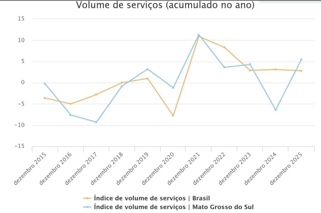 Enquanto na série sem ajuste sazonal, comparado com dezembro de 2024, Mato Grosso do Sul anota uma alta de 2,2%, esse índice nacional fechou mais de um ponto percentual acima (3,4%), segundo dados da Pesquisa Mensal de Serviços do IBGE.