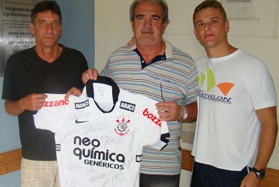 A foto foi tirada no momento da entrega da camisa, e Thiago posa ao lado do pai, Carlos Beronha, e de Ivo Duarte, do departamento de captação de recursos da Santa Casa de Misericórdia de Barretos.