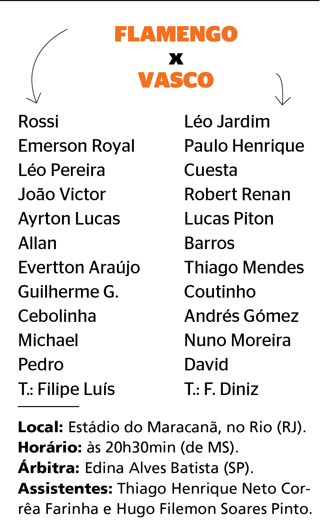 Filipe é quem vai decidir quais jogadores vão ser relacionados. Há chances de uma mescla com os jovens das categorias de base que já vinham atuando. A bola rola às 20h30min (de Mato Grosso do Sul), no Maracanã. Tanto o sub-20 quanto os profissionais tinham o treino marcado para a parte da tarde no Ninho do Urubu.