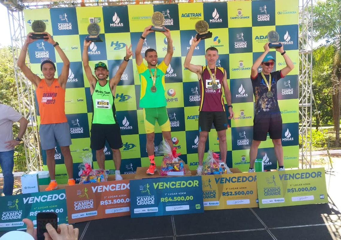 Pódio masculino maratona Campo Grande 2023. Crédito: Divulgação/Maratona CGNa categoria masculino, o campeão da maratona é o carioca Cristiano Carvalho da Silva, de 41 anos. Ele correu longos 42 quilômetros em 2 horas, 39 minutos e 46 segundos e vai levar R$ 4,5 mil em dinheiro.
