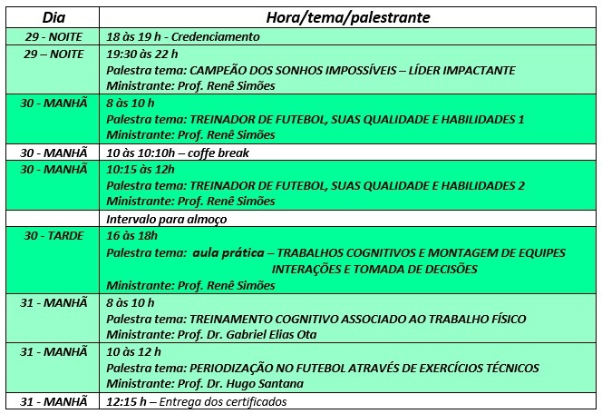 Cronograma completo do curso - Fonte: FFMSAos interessados, o evento terá 100 vagas e sob a bagatela de R$ 250,00, com direito a certificado aos participantes que atingirem a carga horária de 16 horas. Além dele, dois professores universitários também irão palestrar, mais especificamente no último dia do curso. A compra do ingresso acontece pelo site sympla.com.br.