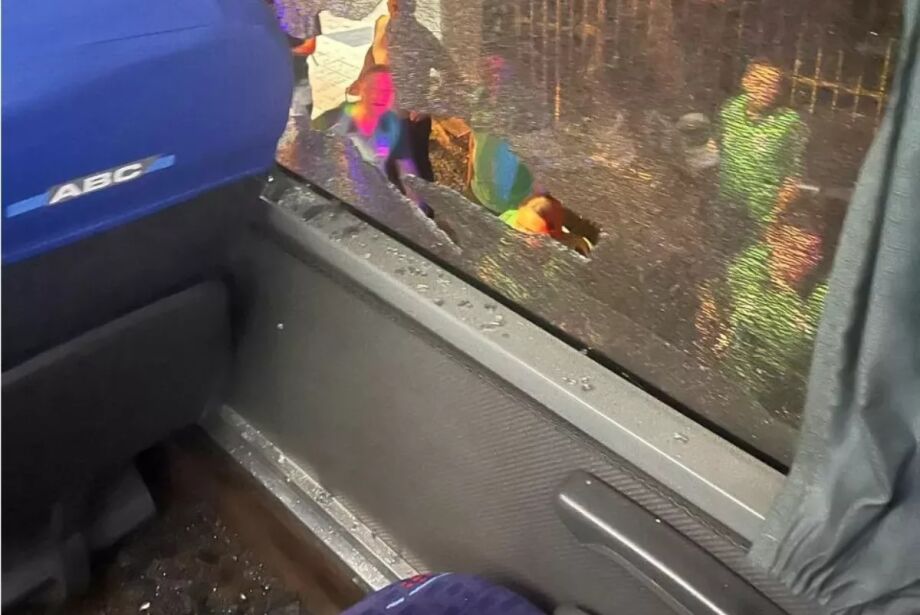 Porém, quando o ônibus já havia se afastado da frente do hotel, um homem de camisa preta corre em direção ao veículo e atira uma garrafa verde que parece ser de cerveja. Com a força do impacto, o vidro do veículo ficou estilhaçado. Ninguém ficou ferido. O Palmeiras registrará um boletim de ocorrências.