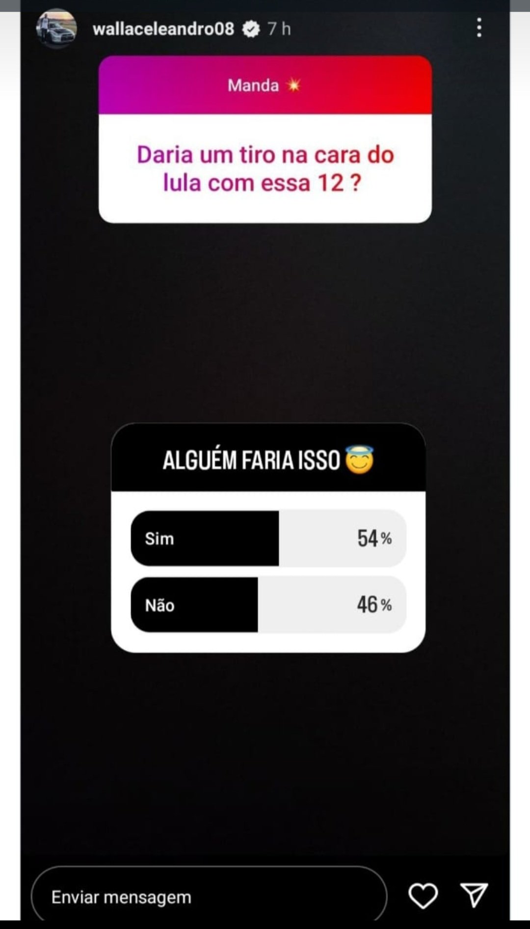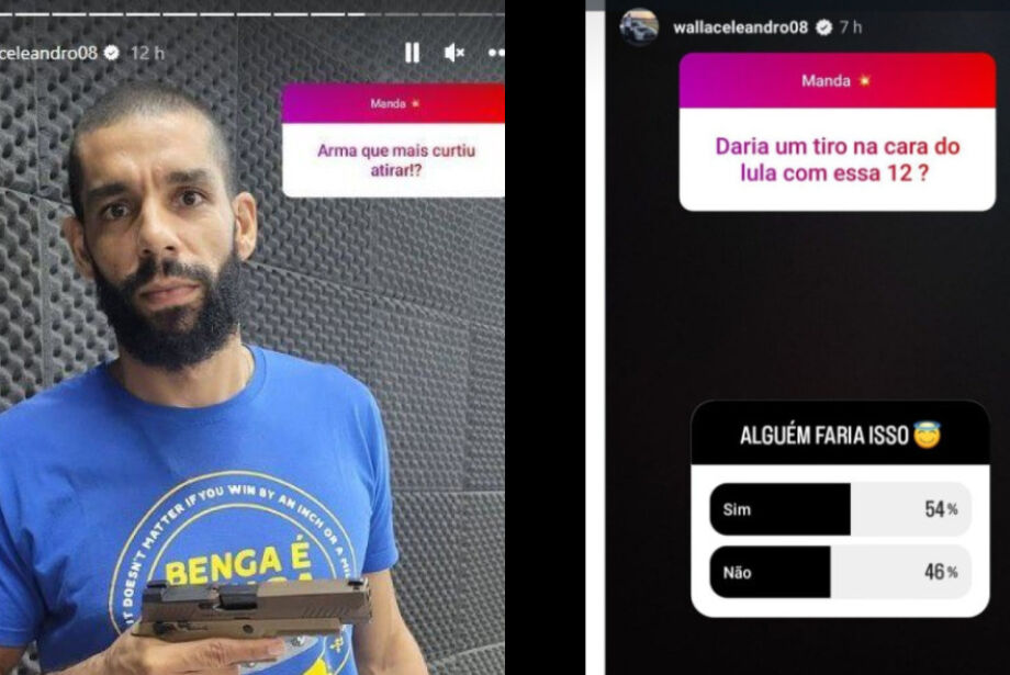 Wallace de Souza fez uma série de postagens nas primeiras horas desta terça-feira sobre a sua experiência em um stand de tiro, compartilhando inclusive a arma que mais gostou de usar. O atleta abriu a caixa de perguntas aos seguidores e foi questionado se "daria um tiro na cara do Lula". O jogador respondeu com uma enquete: "Alguém faria isso: sim ou não?".