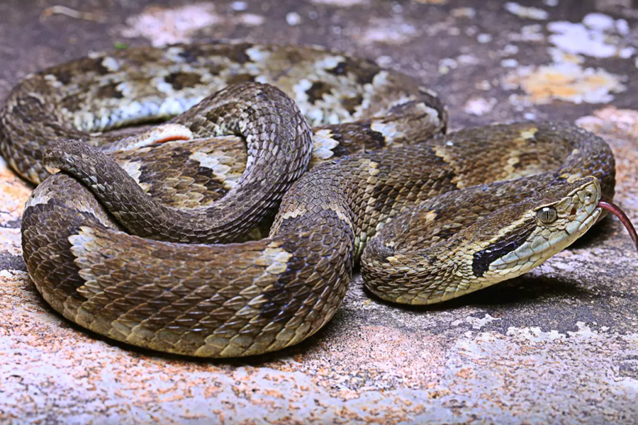 O jararacuçu, uma das serpentes mais perigosas do estado, pode atingir até 2 metros. Seu veneno potente é um mecanismo de defesa eficaz e também auxilia na captura de presas. A coloração desta cobra varia bastante e pode incluir tons de cinza, rosa, amarelo e preto, com manchas triangulares que ajudam na camuflagem.